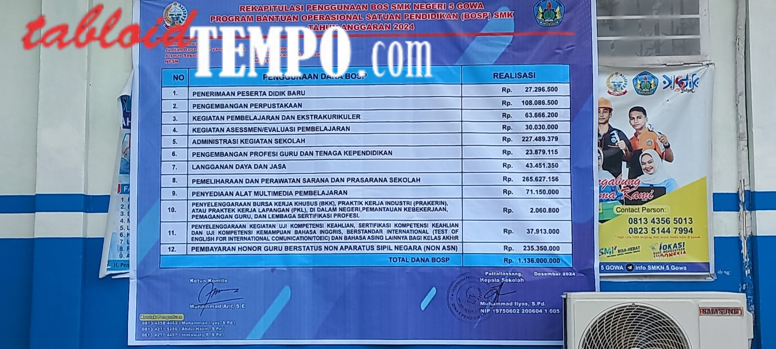 Ketua Komite SMKN 5 Gowa, Muh Arif, didampingi anggota Nurdin Nakku, menjelaskan bahwa Dana BOS digunakan sesuai petunjuk teknis (juknis) BOSP. Peruntukan anggaran antara lain untuk pengadaan buku, bahan praktik tiap jurusan, pembiayaan kegiatan ekstrakurikuler, honor guru dan tenaga kependidikan, pengembangan perpustakaan, serta pemeliharaan sarana prasarana sekolah.