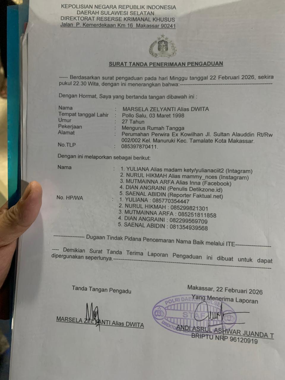TabloidTEMPO.com |MAKASSAR – Didampingi kuasa hukumnya, Ridwan Basri S.H .M.H , Irfan Harris S.H., Fina Febrianti,S.H dan A.Try Tunggal Putra,S.H. Marsela Zelyanti alias Dwita,resmi menempuh jalur hukum terkait dugaan tindak pidana pencemaran nama baik melalui media elektronik. Laporan tersebut dilayangkan ke Direktorat Reserse Kriminal Khusus (Ditreskrimsus) Polda Sulawesi Selatan pada Minggu malam (22/02/2026).